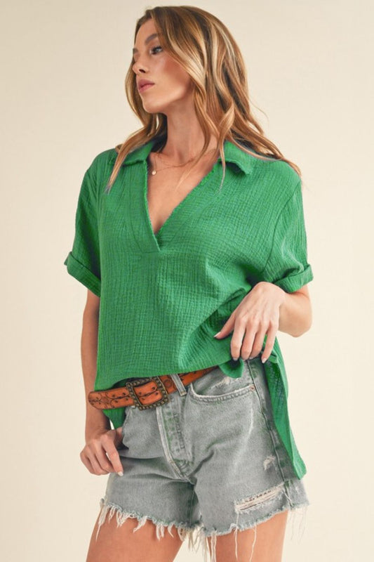Aemi + Co Side Slit Johnny Collar Short Sleeve Cotton Gauze Blouse
