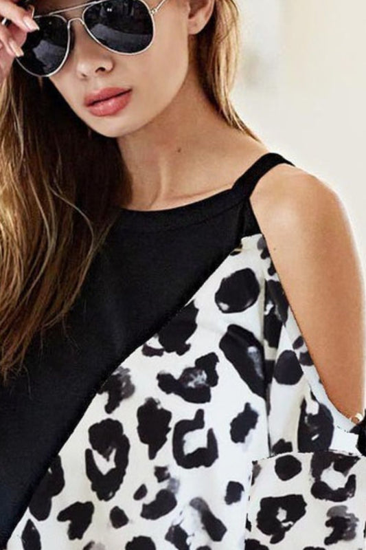 BiBi French Terry Leopard Cold Shoulder Top