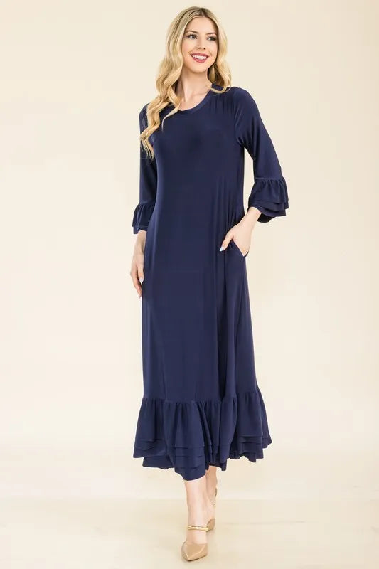 Celeste Full Size Modest Midi Dress with 3/4 Ruffle Bell Sleeves Plus Size