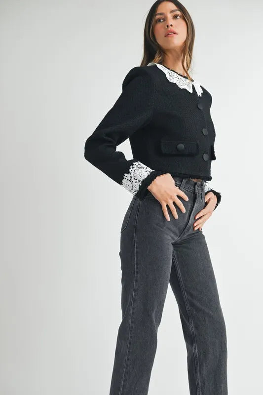 MABLE Lace Trim Collar Tweed Crop Jacket