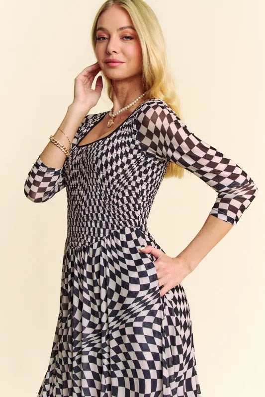 Davi & Dani Printed Checker Mesh Flowy Maxi Dress