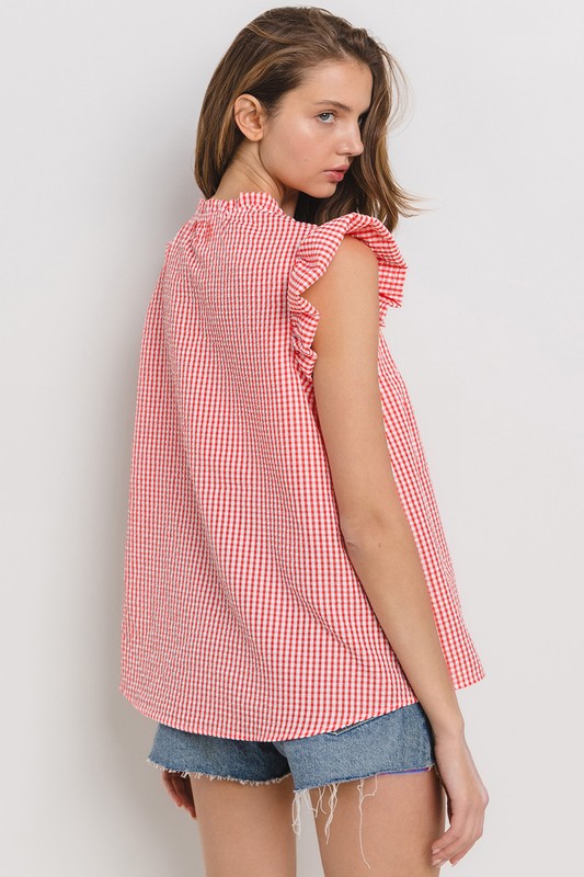 Ces Femme Plaid Notched Ruffled Cap Sleeve Blouse