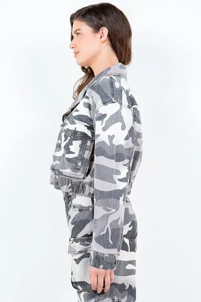 American Bazi Full Size Camouflage Zip Up Cropped Rider Jacket Plus Size