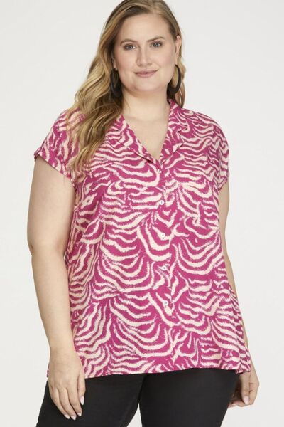 She + Sky Full Size Printed Button Down Cap Sleeve Shirt Plus Size