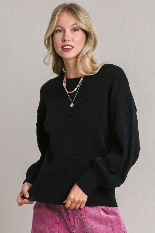 Umgee Full Size Pom Pom Knit Heart Front Round Neck Sweater Plus Size