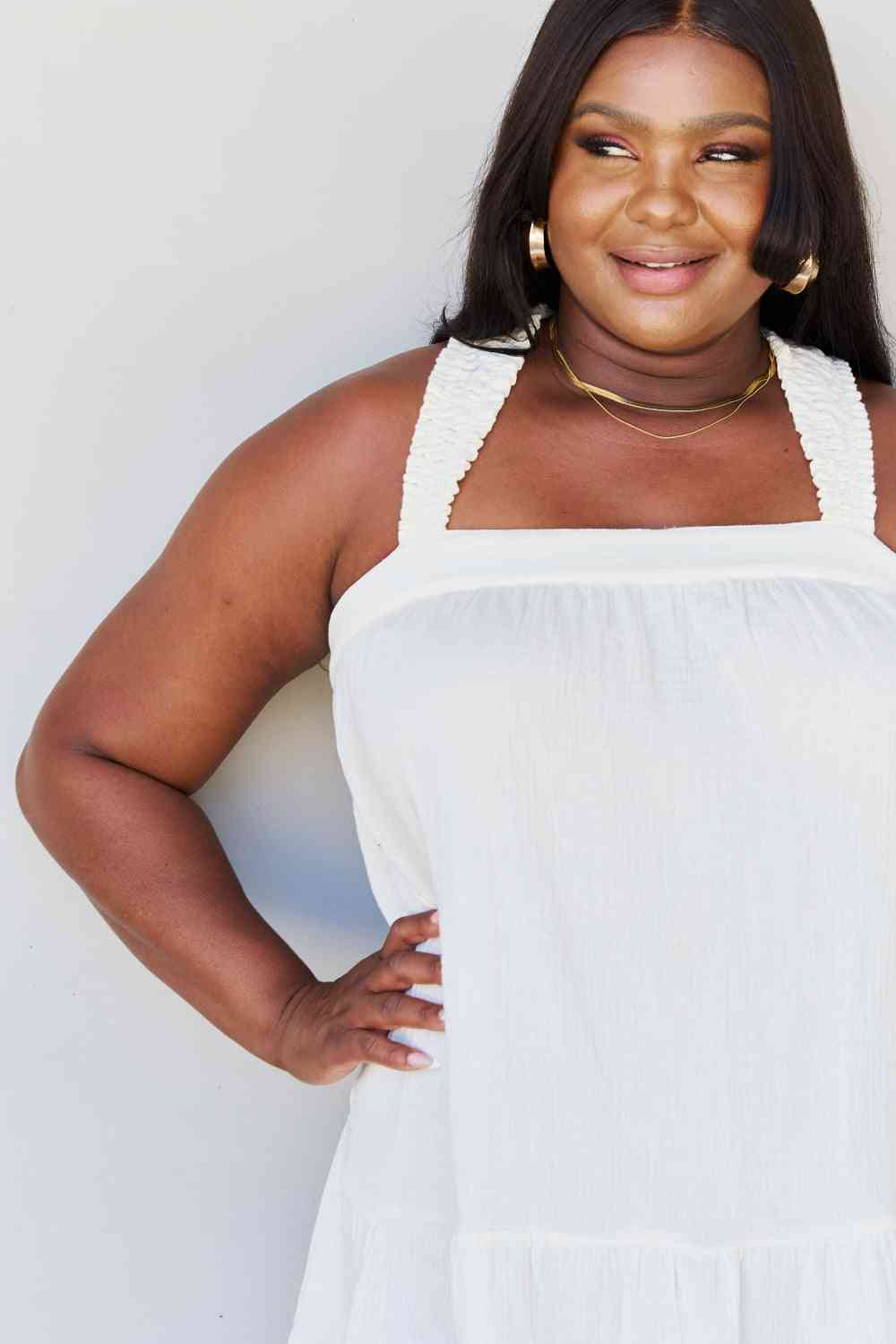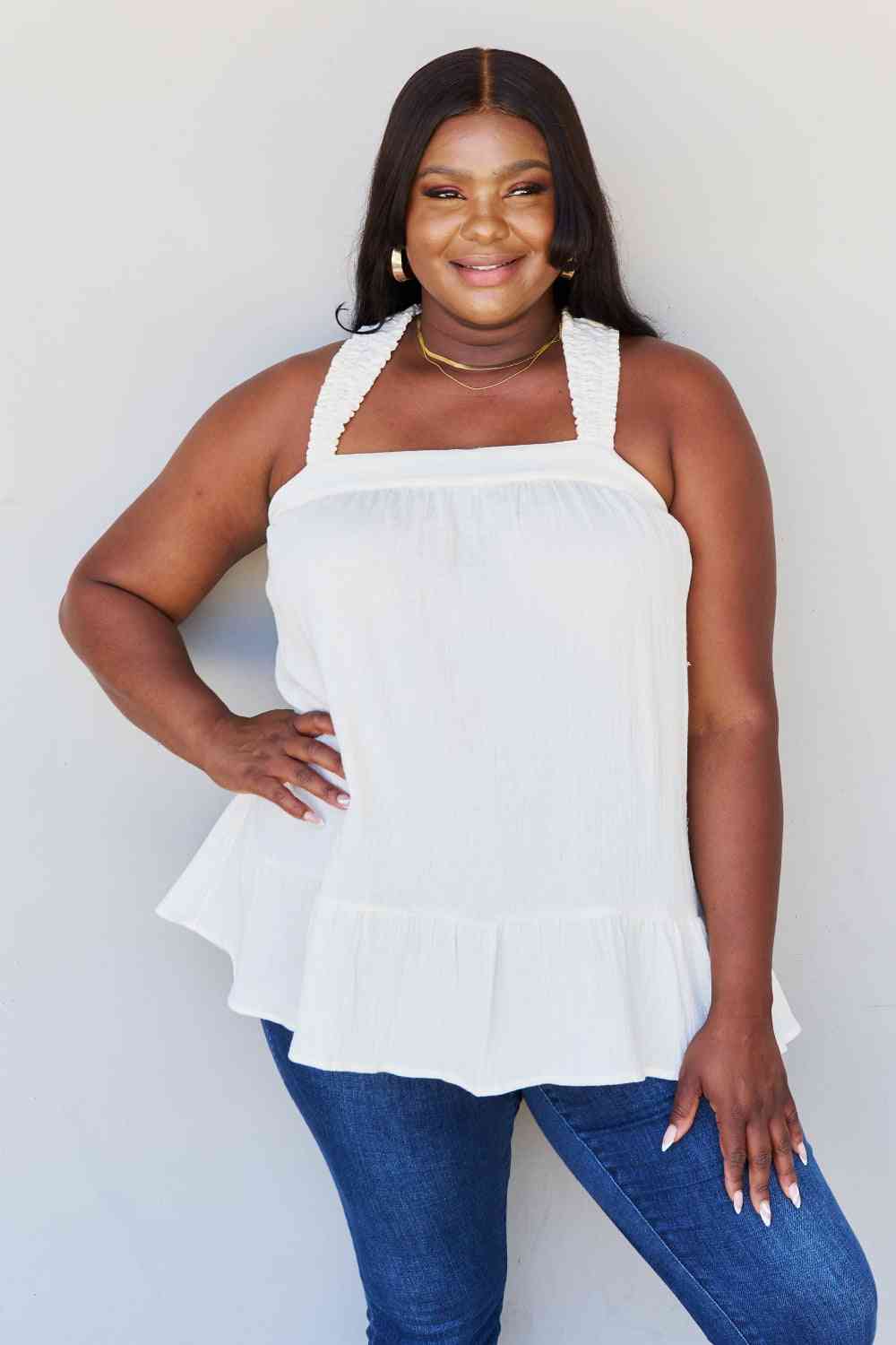 This chic and feminine blouse is the perfect addition to your wardrobe, combining comfort, style, and a touch of playful elegance. This tunic top is perfect for warm weather and will keep you feeling cool and comfortable all day long. The loose and flowy fit drapes beautifully, flattering all body types and providing a relaxed yet stylish silhouette. One of the standout features of this top is the ruffled detailing. The ruffles adorn the straps, adding a delightful and eye-catching touch. They bring a sense of femininity and sophistication, elevating this tunic top from ordinary to extraordinary. At the back, you'll find a charming tie detail that adds a touch of allure. This back tie not only adds visual interest but also allows you to adjust the fit according to your preference, ensuring a comfortable and flattering look. The versatility of this top is another major selling point. Whether you're going for a casual day out, a beach vacation, or a semi-formal event, this tunic top can easily be dressed up or down to suit any occasion. Pair it with jeans or shorts for a relaxed daytime look, or dress it up with tailored pants or a skirt for a more sophisticated ensemble.